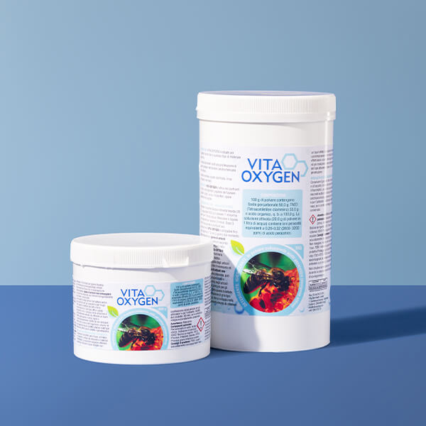 Vita-Oxygen, polvere da sciogliere in acqua, è indicato per l'igiene di arnie, favi e qualsiasi tipo di materiale apistico in modo da renderli ostili alla proliferazione degli agenti patogeni dell'alveare. Non è corrosivo sui materiali, con l'eccezione di rame e sue leghe.